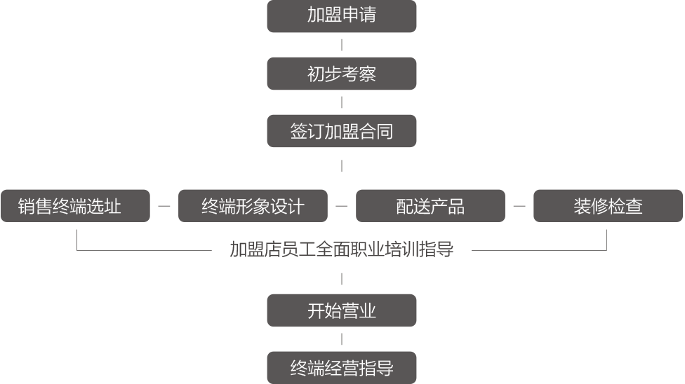 公司強大的市場團隊長期投身前線,為各地加盟商的店面運營、推廣、促銷、團隊管理等經營活動長期提供技術指導,幫助加盟商無壓力經營。